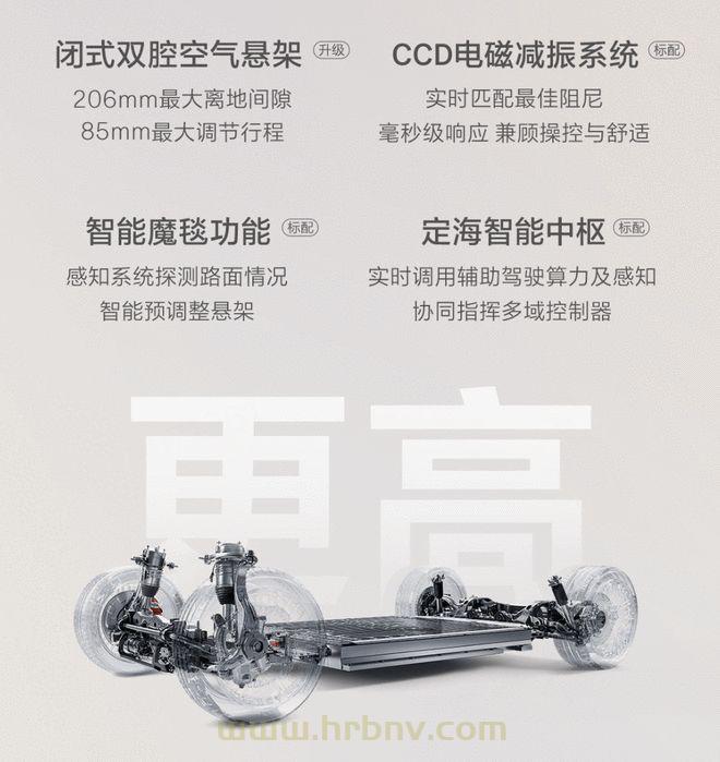 焕新001升级闭式双腔空气悬架,全系标配CCD电磁减振系统和智能魔毯功能,它能提前识别减速带等路面状态,拥有毫秒级响应,能够根据路况、车速及驾驶模式智能调节悬架软硬与高低,精准平衡极致操控与豪华舒适之间的矛盾,无论是赛道激烈驾驶还是长途驾驶,都可以从容应对。