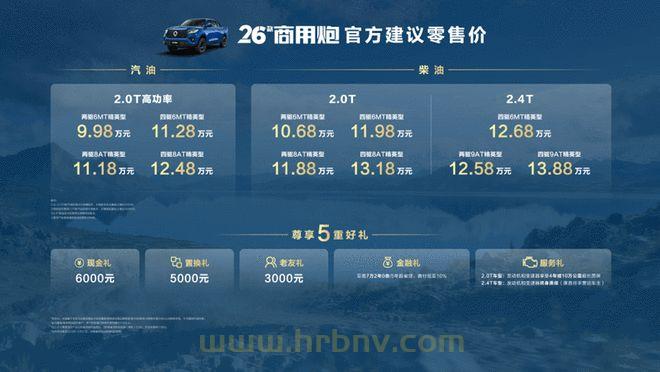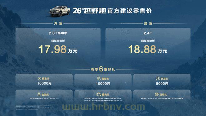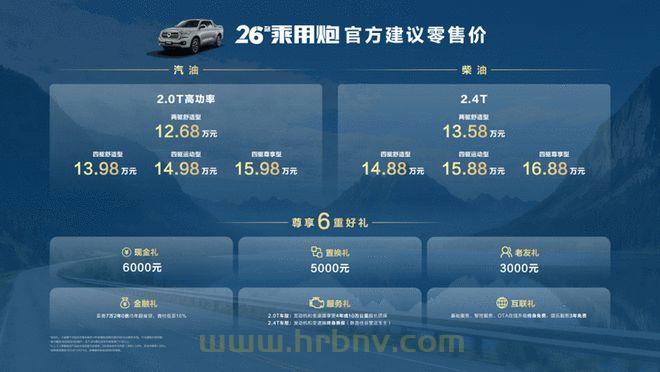 随着新车的上市,官方还发布了一系列的购车权益。其中:2026款商用炮用户可享6000元现金礼、5000元置换礼、3000元老友礼以及金融礼、服务礼五重大礼;2026款乘用炮可享受6000元现金礼、5000元置换礼、3000元老友礼以及金融礼、服务礼、互联礼六重大礼;2026款越野炮用户则可享10000元现金礼、10000元置换礼、5000元老友礼以及金融礼、服务礼、互联礼六重大礼。