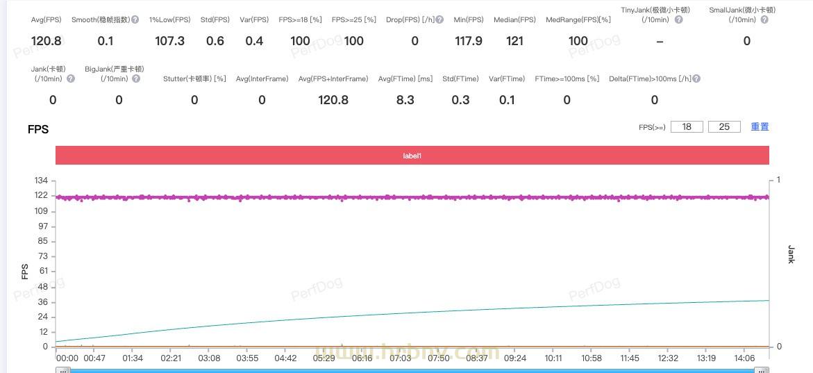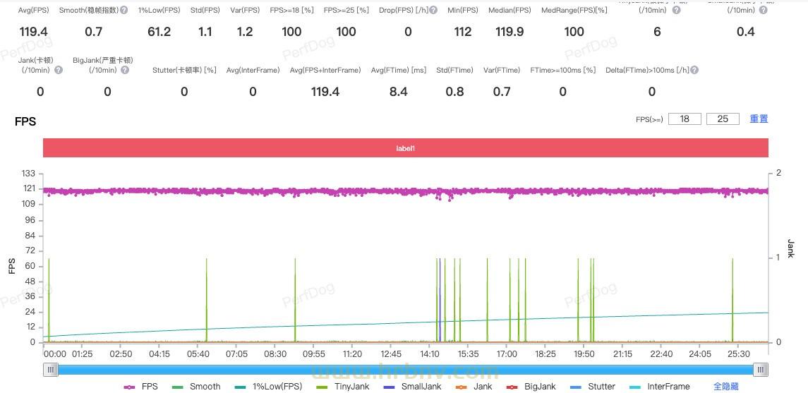 《和平精英》流畅画质下,25分钟的高强度跑图,平均帧率可以达到119.4帧,稳帧指数达到了0.7,全程流畅不卡顿。