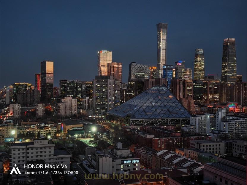 从这张夜景样张来看,荣耀 Magic V6和主摄和 CIPA 6.5 级防抖表现亮眼:在 1/33s 的慢快门下,画面依然清晰稳定,无抖动模糊。解析力让中国尊等建筑细节分明,夜景纯净度高,高光压制到位,色彩还原自然,充分展现了其夜神影像的实力。