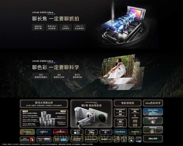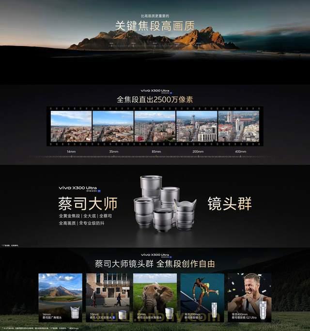 vivo X300 Ultra专业V单搭载了强大的蔡司大师镜头群。14mm蔡司超广角镜头拥有1/1.28英寸超大底和CIPA 6.0专业级防抖,风光人像视频全场景适用;35mm蔡司人文纪实镜头II采用蓝图×索尼LYTIA 901,1/1.12英寸超大底,原生35mm光学直出,镀膜全面升级;85mm蔡司云台级长焦镜头是第五代蔡司2亿灭霸长焦,蓝图×三星HP0,自研多项技术,至高可实现每秒60次自动对焦,支持3° OIS光学防抖(CIPA 7.0级)。还有等效400mm的蔡司增距镜 G2 Ultra和等效200mm的蔡司增距镜 G2,全焦段直出2500万像素,从14mm到400mm,不管哪个焦段按下快门都能得到扎实画质。