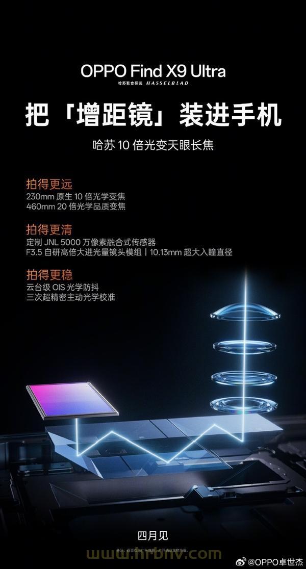 OPPO Find X9 Ultra将于4月21日19:00发布,将全球首发哈苏10倍光变天眼长焦镜头,首创5反射棱镜,支持原生10倍光学变焦、20倍光学品质变焦、至高120倍数码变焦,号称把增距镜装进手机。