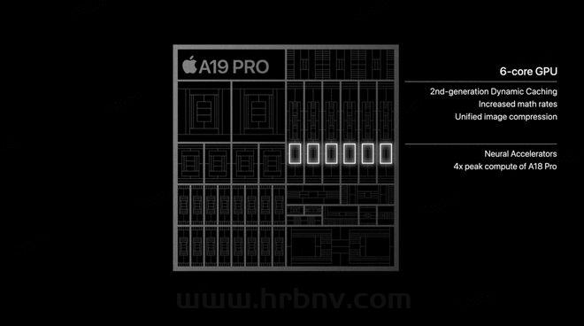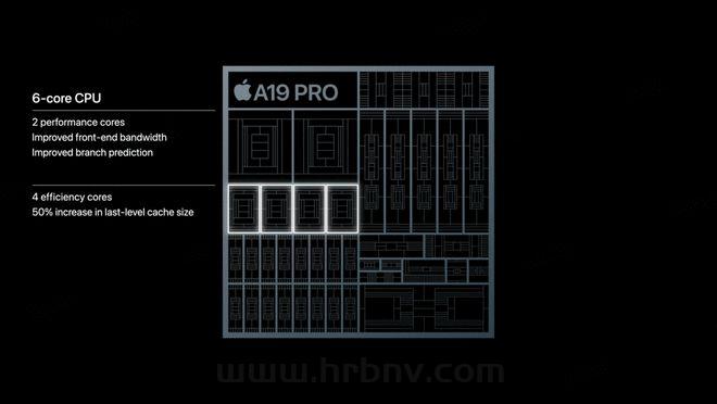 搭载的A19 Pro芯片性能相比前代提升40%。,满血6核CPU与6核GPU可以释放更强性能。