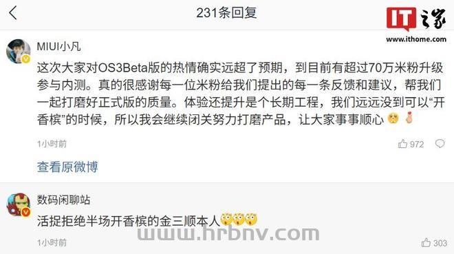 这次大家对 OS3Beta 版的热情确实远超了预期,到目前有超过 70 万米粉升级参与内测。真的很感谢每一位米粉给我们提出的每一条反馈和建议,帮我们一起打磨好正式版的质量。体验还提升是个长期工程,我们远远没到可以“开香槟”的时候,所以我会继续闭关努力打磨产品,让大家事事顺心。