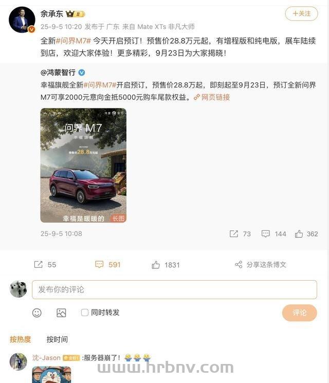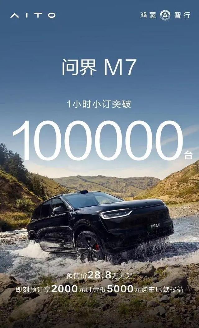 43分钟。10万台。服务器崩了。这不是明星演唱会门票开售。这是一台起售价28.8万元的SUV创造的奇迹。全新问界M7。9月5日开启预订。24小时后。订单锁定15万台。余承东说。卖爆了。远超预期。